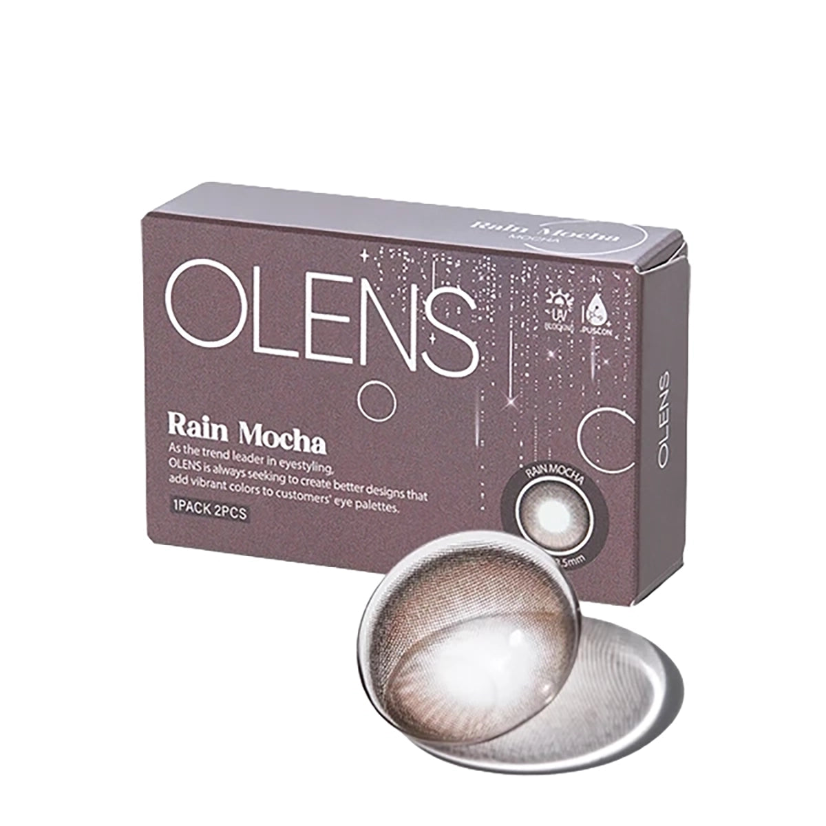 OLENS Rain Mocha features a rich mocha mousse hue paired with a delicate rainlight pattern that adds subtle highlights and depth to the eyes. The soft raindrop-like details create a trendy yet refined look, giving the gaze a smooth and glossy dimension.