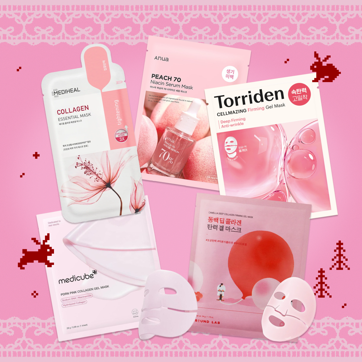 Medicube PDRN Pink Vita Coating Mask + Round Lab Camellia Deep Collagen Firming Gel Mask + Torriden Cellmazing Firming Gel Mask + Anua Peach 70 Niacin Serum Mask + Mediheal Collagen Essential Mask
